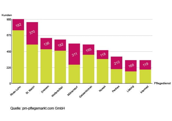 Die Analyse bezieht sich auf Betreiber, die den Fokus auf die ambulante Pflege gesetzt haben. Die Betreiber der übrigen rund 2.300 Pflegedienst-Standorte in Deutschland fokussieren sich auf die stationäre Pflege und wurden in der folgenden Analyse nicht beachtet.