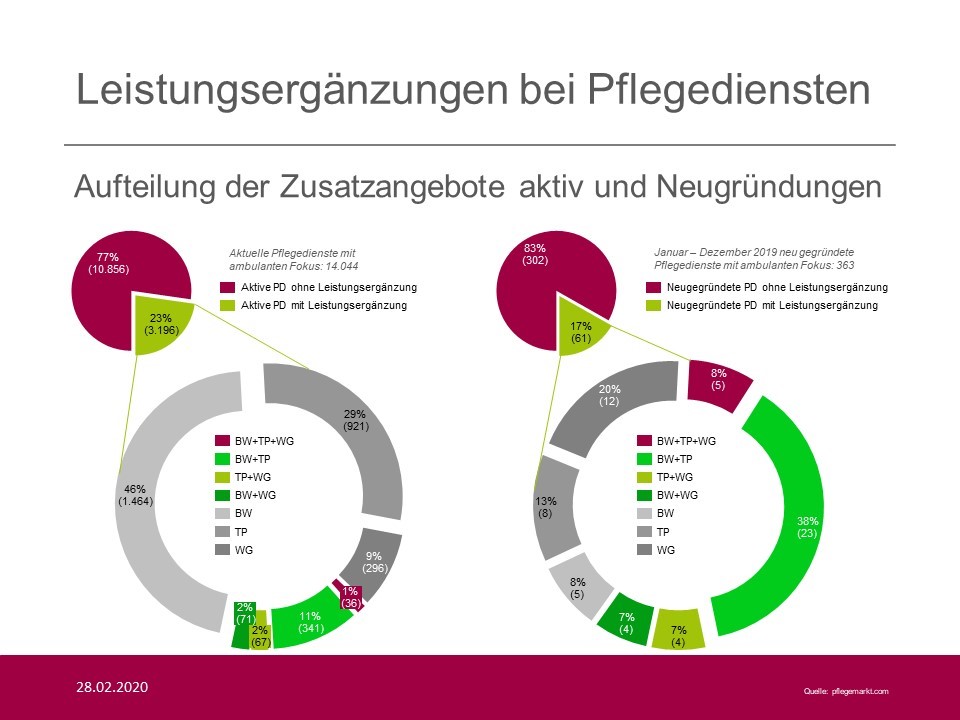 Zwar haben bereits im Betrieb befindliche Pflegedienste prozentual häufiger (23 Prozent) eine Leistungsergänzung als die im Laufe des Jahres 2019 neu gegründeten Pflegedienste (17 Prozent), dies lässt sich jedoch vor allem auf die längere Zeit am Markt und die damit verbundene Chance Leistungsergänzungen im Nachhinein aufzubauen zurückführen. Deutlich spannender ist hierbei die Verteilung der bestehenden Leistungsergänzungen: