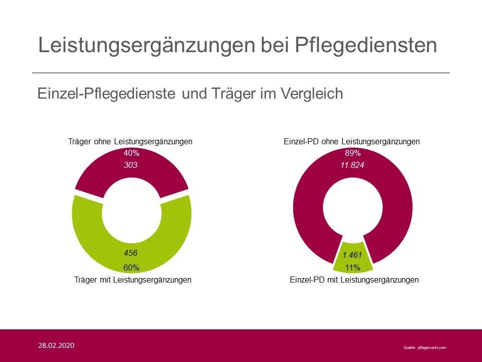 Um die Bedeutung von Zusatzangeboten und Leistungsergänzungen für den Erfolg von Pflegediensten besser in Zusammenhang setzen zu können wurden für diese Analyse die Pflegedienste noch einmal unterteilt – Pflegedienstbetreiber, die mehr als einen der betrachteten 14.044 Pflegedienststandorte betreiben, wurden hierbei zu einem Träger zusammengefasst, Pflegedienste, die nur über einen ambulanten Standort verfügen, wurden als Einzel-Pflegedienste erfasst.